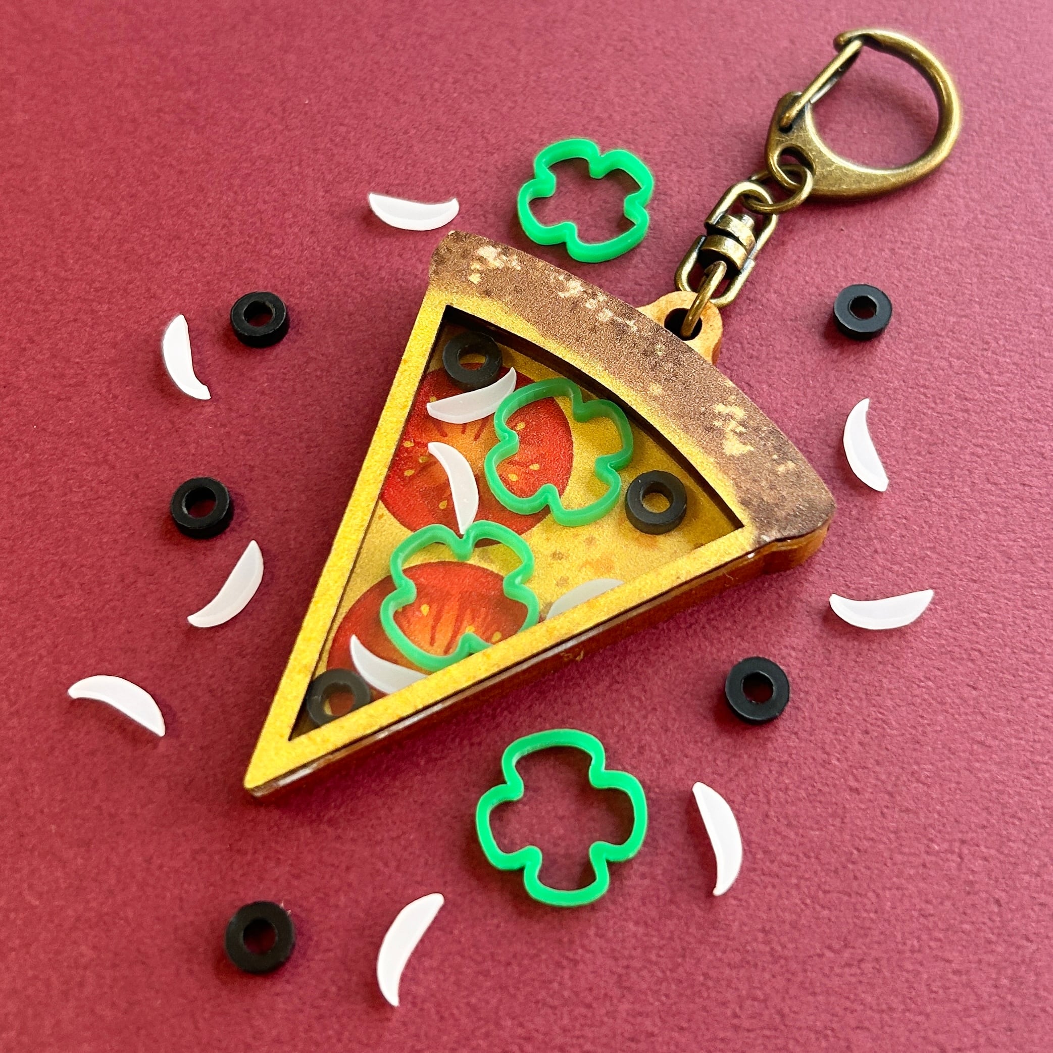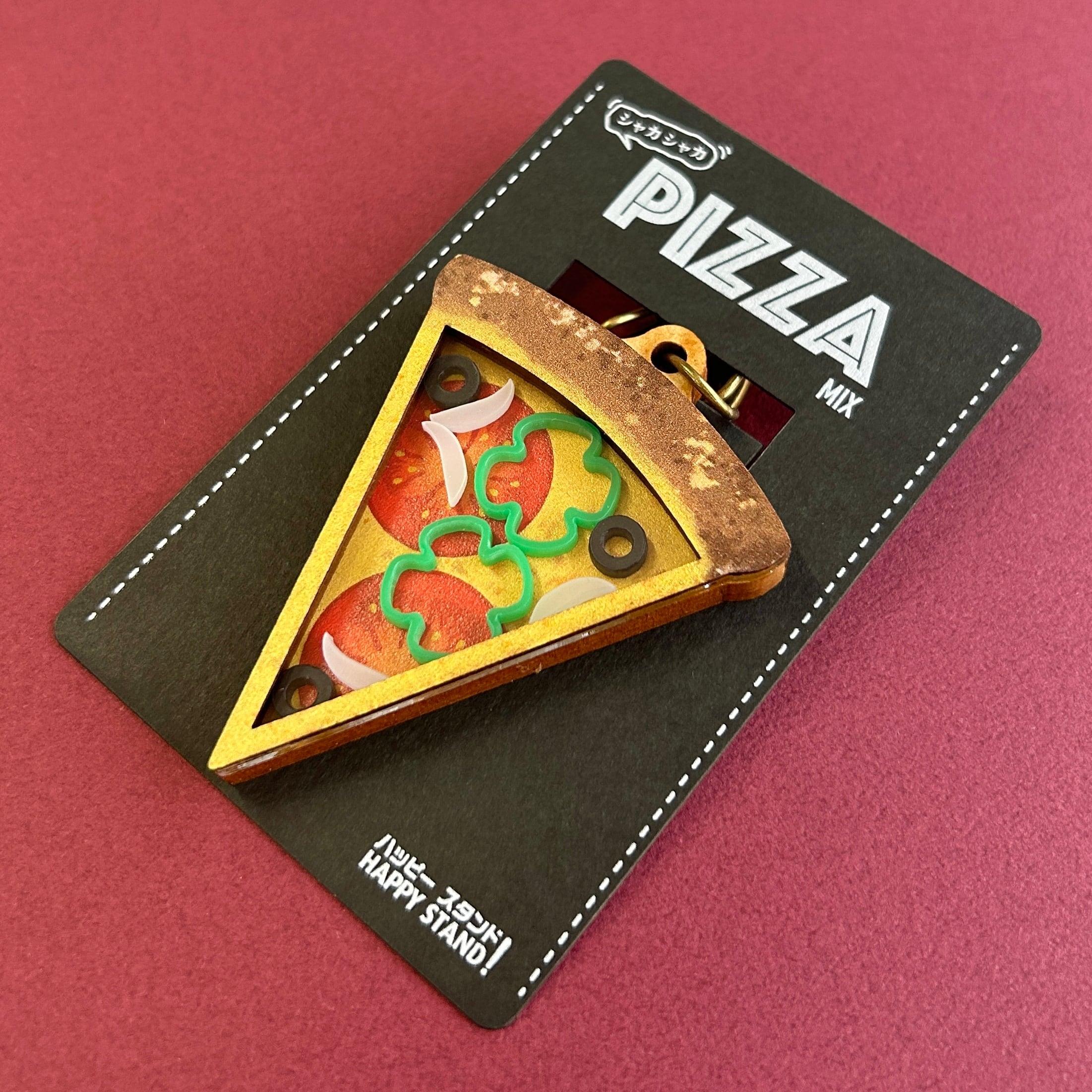 ピザの具材が跳ね回るシャカキーホルダーです。